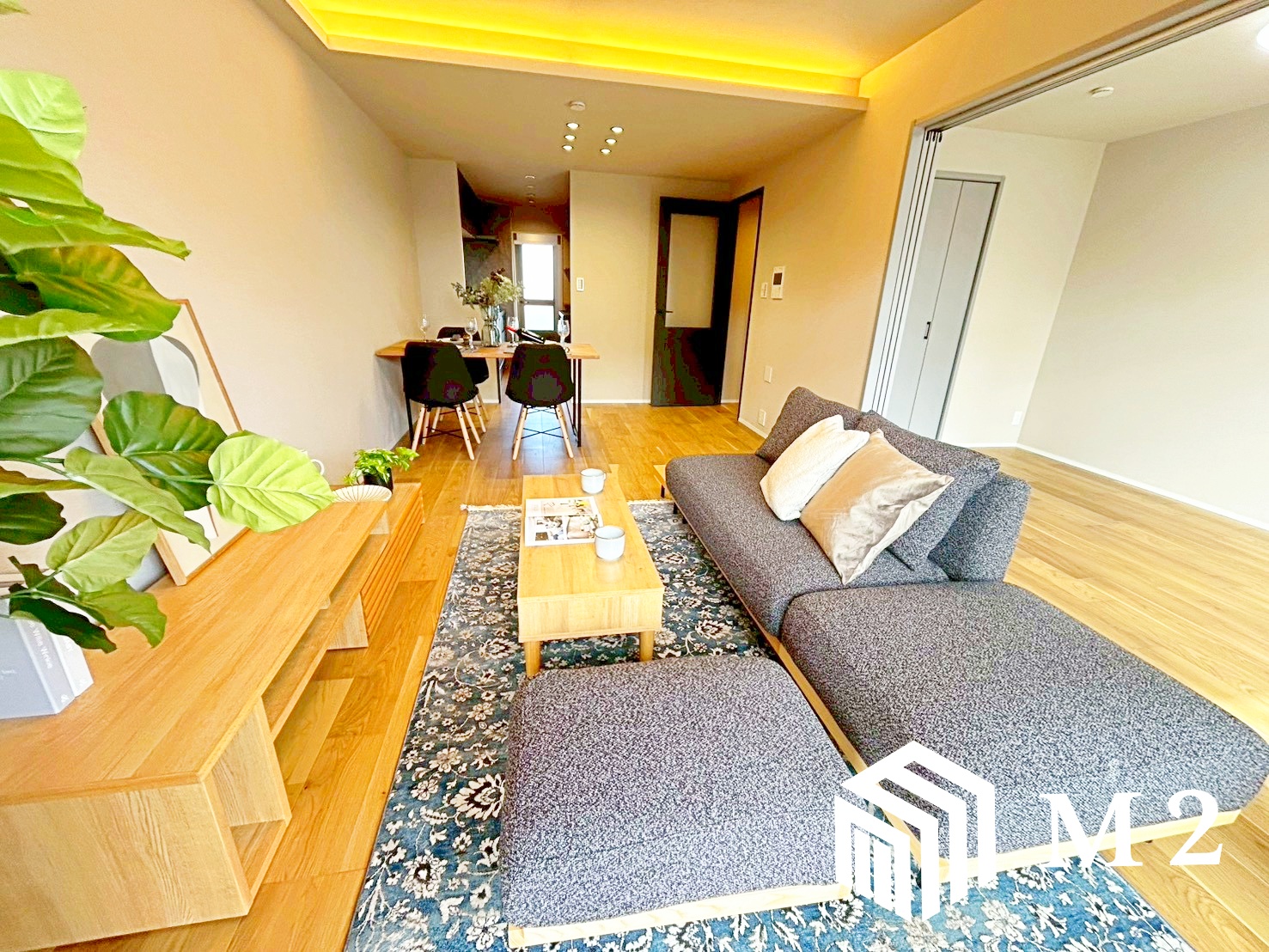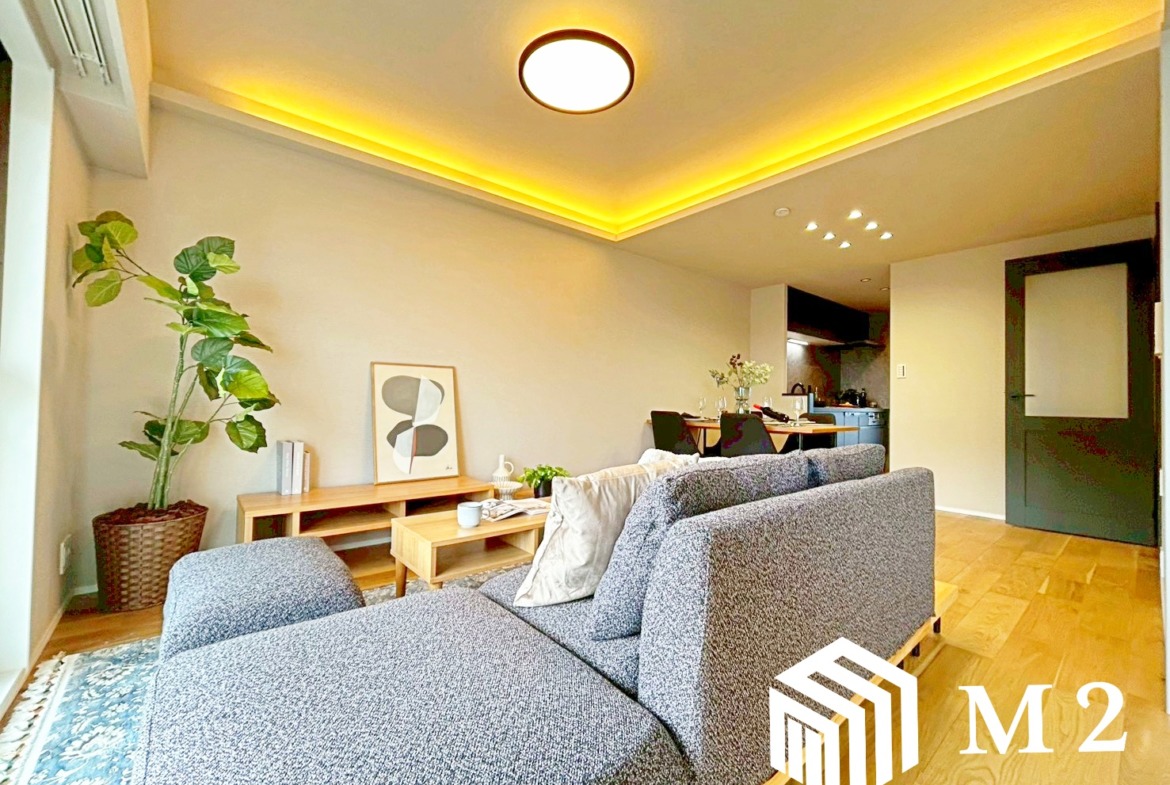 *織り上げ天井と間接照明が織りなす、上質で落ち着いたリビング空間。